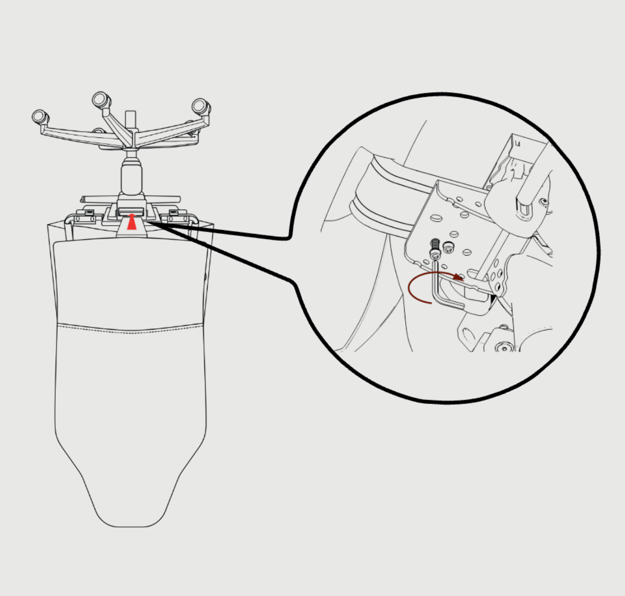 Placez la croix de base et insérez le ressort à gaz sans forcer, puis glissez le manchon en plastique sur le ressort à gaz.